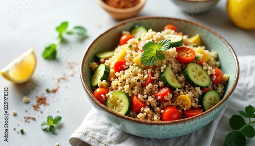 Healthy quinoa salad bowl filled with colorful vegetables. Fresh vibrant salad. Perfect meal for healthy diet summer. Delicious, nutritious. Easy, satisfying choice. Perfect for vegan anyone looking