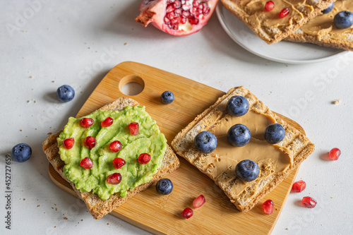 Healthy sandwiches on a cutting board. Healthy eating. Superfood. Avocado and pomegranate toast. Toasts with peanut butter and blueberries.