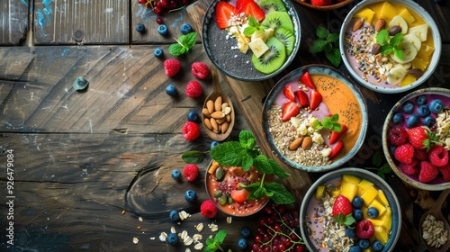 Healthy smoothie bowls topped with fruits, seeds, and nuts, arranged on a wooden table, promoting nutritious breakfast options.