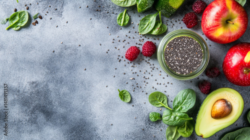 Healthy smoothie with chia, apple, spinach, and avocado on a gray concrete surface