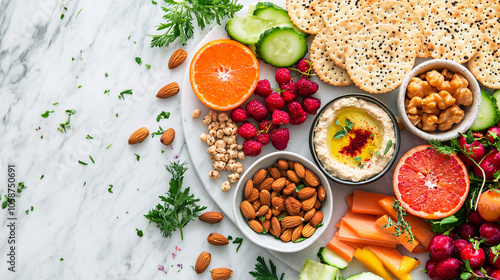Healthy Snack Platter with Hummus, Crackers, Fruit and Nuts on Marble Background
