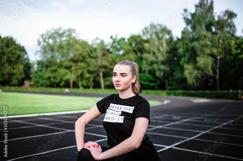 Healthy sports lifestyle. Athletic young woman in a sports dress doing fitness exercises. Fitness woman at the stadium. Young woman doing morning exercise. Young girl goes in for sports. Stretching.