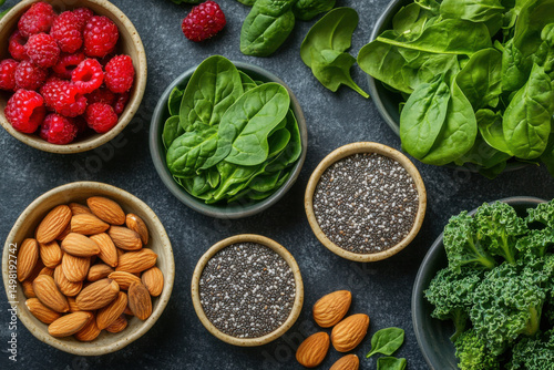 Healthy Superfoods Flat Lay with Seeds, Nuts, and Greens