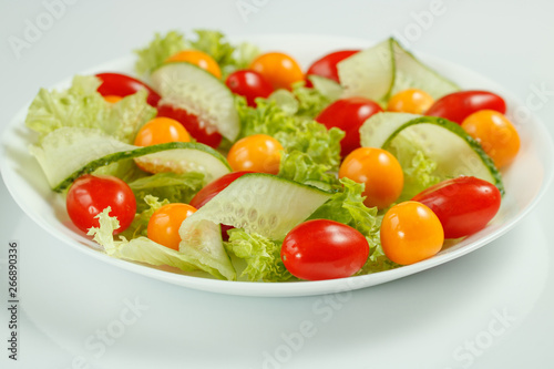 healthy vegan lunch with green salad and red yellow tomatoes on a white background