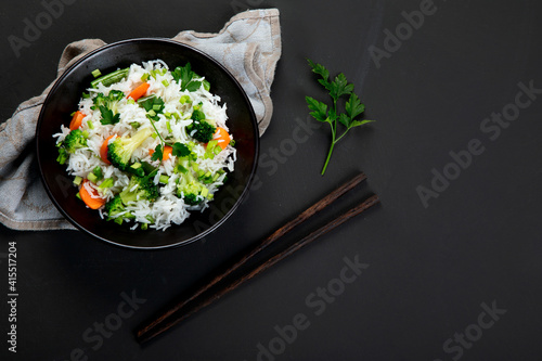 Healthy vegan rice with boiled broccoli, carrot and spring onion