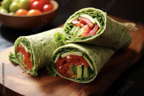 Healthy Vegan Vegetable Wrap with fresh Lettuce, Sliced Cucumber and Tomatoes - Delicious Vegetarian Food Enclosed in Half