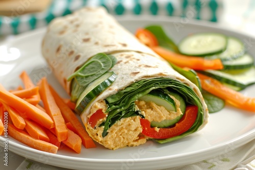 Healthy Veggie and Hummus Wrap with Sliced Bell Peppers, Cucumbers, and Spinach on a White Plate