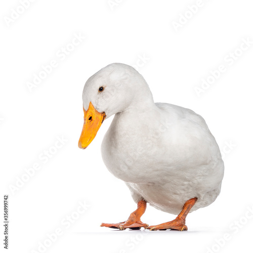 Healthy white adult Peking duck, standing facing front. Looking towards camera, isolated on white background.