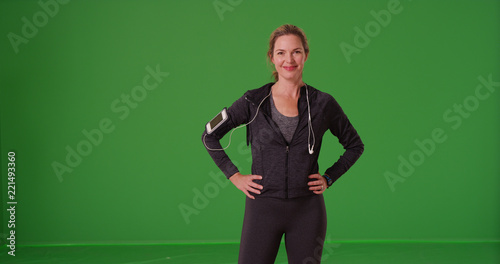 Healthy white middle aged woman in sportswear posing on green screen