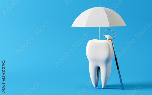 Healthy white tooth with dentist mirror and umbrella protection. Oral health and dental inspection teeth. Medical dentist tool, children healthcare, 3D render