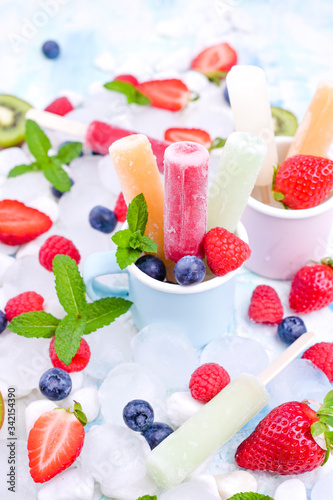 Healthy Whole Fruit Popsicles with Berries Kiwi strawberries on light background with a decor of ice, mint. Tasty fruit ice-cream in the mug. Copy space
