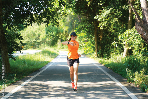 Healthy woman jogging run and workout on road outdoor. Asian runner people exercise gym with fitness session, nature park background. Health and Lifestyle Concept
