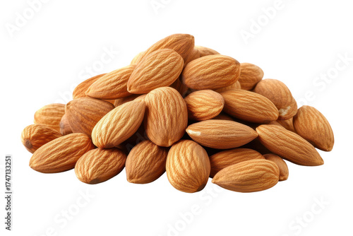 Heap of almond nuts perfectly arranged on a white background, showcasing their smooth texture and rich color for culinary and healthy eating purposes