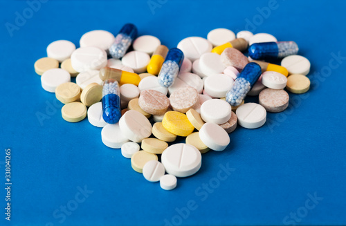 Heap of pills, tablets, capsules on blue background. Drug prescription for treatment medication health care concept wth copy space.