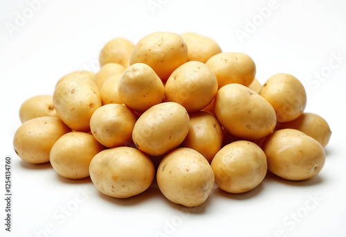 Heap of raw potatoes isolated on white background. Pile of yellow dirty tubers, uncooked vegetables. Harvested potato crop. Organic food ingredients. Healthy eating and lifestyle.
