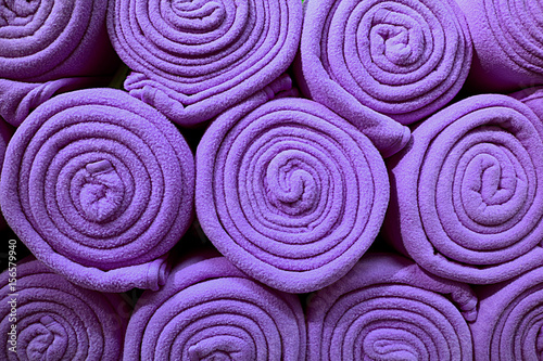Heap of Rolled up Bright Purple Colored Fleece Blankets, for Background or Fabric Texture