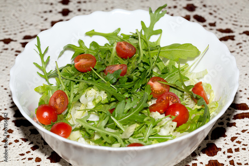 Heap of ruccola, lettuce leaves and cherry tomatoes