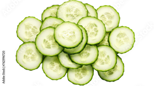 heap of sliced cucumber on white isolated background, top view