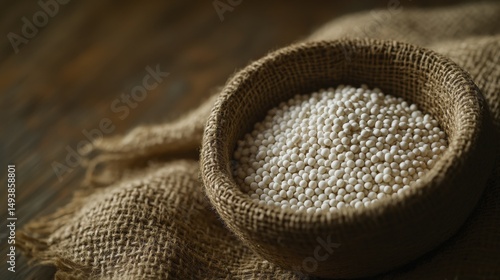 Heap of White Tapioca Pearls in Rustic Burlap Sack on Wooden Surface