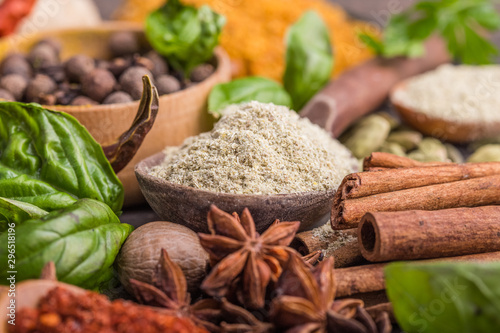 Heaps of various ground spices on wooden background. Georgian spices, Indian spices, Arabian spices. Spice variety. Herbs and spices