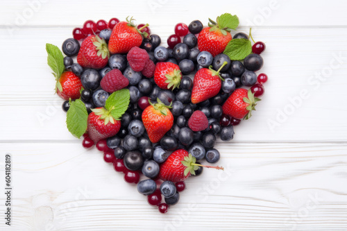 Heart, formed from different berries like strawberries, blackberries, raspberries and blueberries. Created using AI tools.