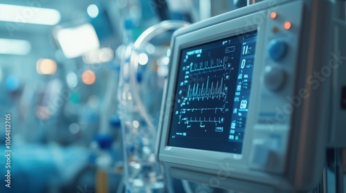 Heart Rate Monitor in Hospital ICU. ICU heart rate monitor showing patient vitals, essential for critical care monitoring in a hospital environment.