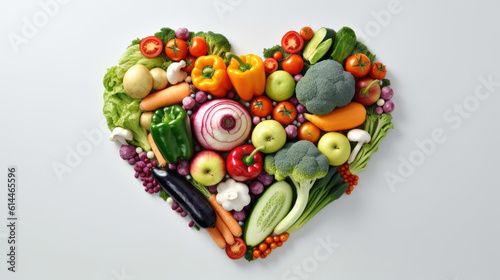 Heart shape made of different vegetables isolated on white background. Heart symbol. Vegetarian diet and healthy organic food concept. AI generated