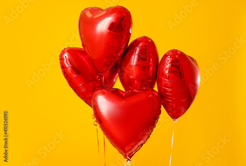 Heart shaped air balloons on color background