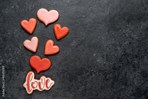 Heart shaped cookies and cookies with letters love for valentine's day on stone background with copy space for your text