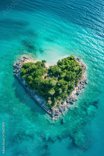 Heart shaped island surrounded by perfect turquoise water in sunlight