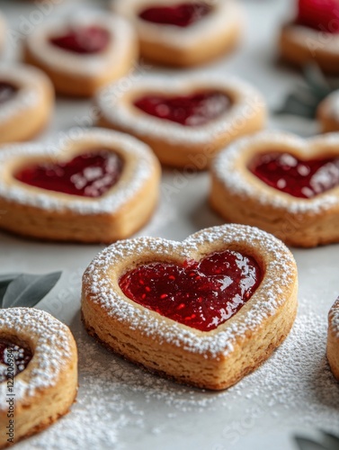Heart shaped linzer cookies with raspberry jam on white table, sprinkled with powdered sugar, aesthetic food photography