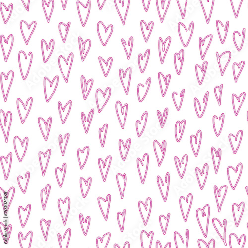 Hearts neon polka dot line seamless pattern hand drawn. Pink doodle symbols on white.