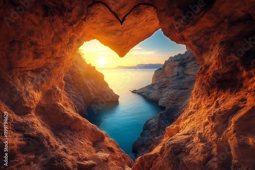 Heart-shaped arch, with blue water in the center and a sunset sun star