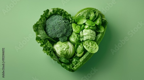 Heart-shaped arrangement of fresh green vegetables including broccoli, spinach, and lettuce on a light green background.