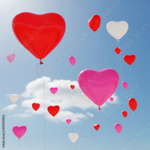 Heart-shaped balloons floating in the blue sky.