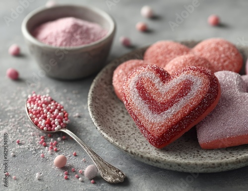 Heart-shaped cookies, pink sprinkles, and powdered sugar