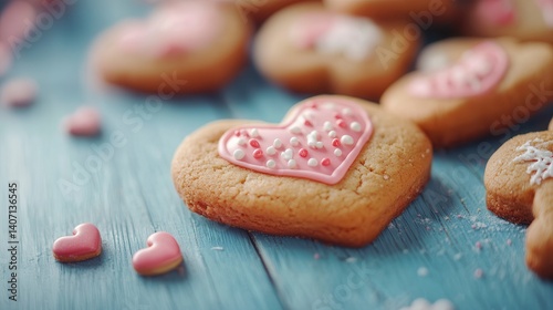 Heart-shaped cookies with pink icing and sprinkles on a blue wooden background.