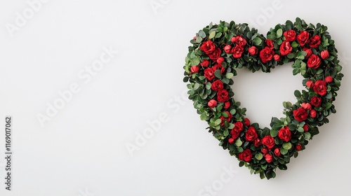 Heart-shaped floral wreath with red roses and green leaves on white background.