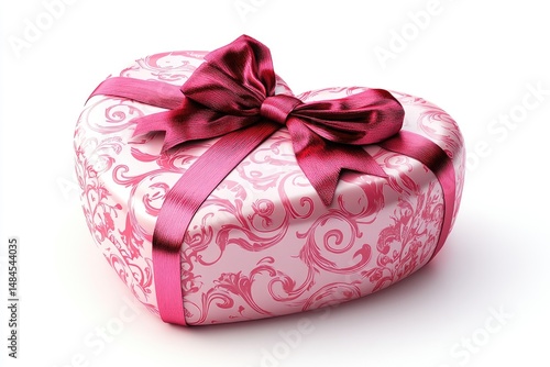 Heart-shaped gift box with a decorative ribbon. A beautiful, pink heart-shaped gift box, meticulously wrapped with a delicate pink pattern and a maroon ribbon bow, presented on a white background
