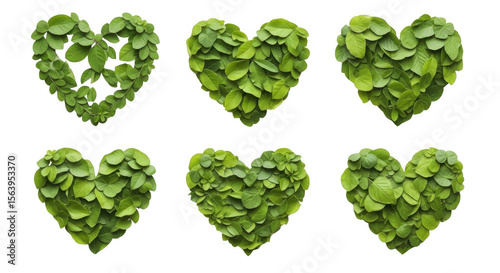 Heart-shaped Green Leaf Arrangements for Eco-friendly Themes and Decorations, isolated on a transparent background