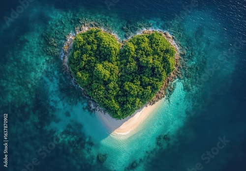 Heart-Shaped Island Surrounded by Turquoise Waters and Lush Greenery in Tropical Paradise