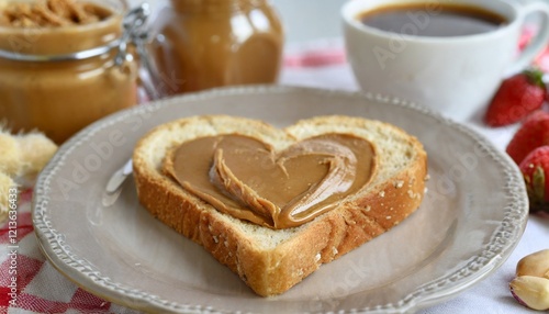 Heart-shaped piece of toast bread with a sweet spread peanut butter
