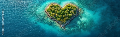 Heart-shaped tropical island surrounded by crystal-clear water, romantic vacation destination