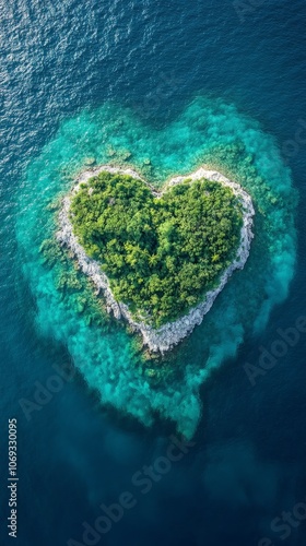 Heart-shaped tropical island surrounded by crystal-clear water, romantic vacation destination