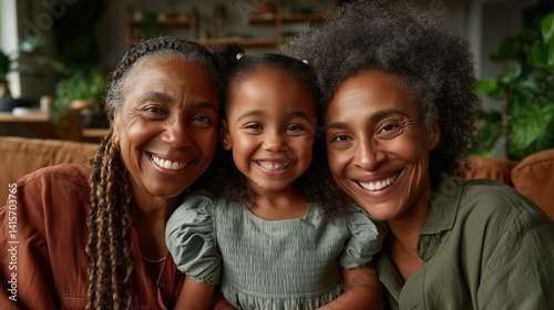 Heartwarming portrait of three generations of women smiling warmly, showcasing joy and family bonding in a cozy setting.