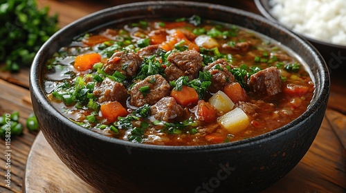 Hearty beef stew in a dark bowl, garnished with fresh herbs, served with a side of rice.