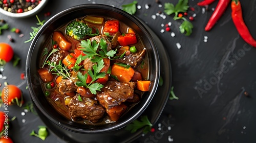 Hearty Beef Stew with Tender Vegetables and Fresh Parsley in Black Bowl on a Dark Surface with Colorful Spices Top View