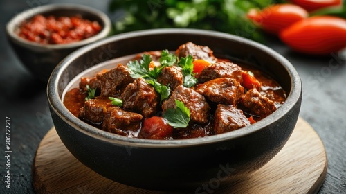 Hearty bowl of beef goulash with tender meat and a rich paprika sauce.