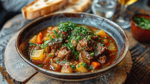 Hearty Bowl of Hungarian Goulash Stew with Fresh Vegetables and Herbs