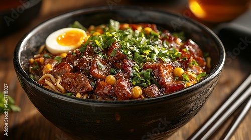 Hearty bowl of savory noodles with tender meat, a soft egg, and crunchy toppings